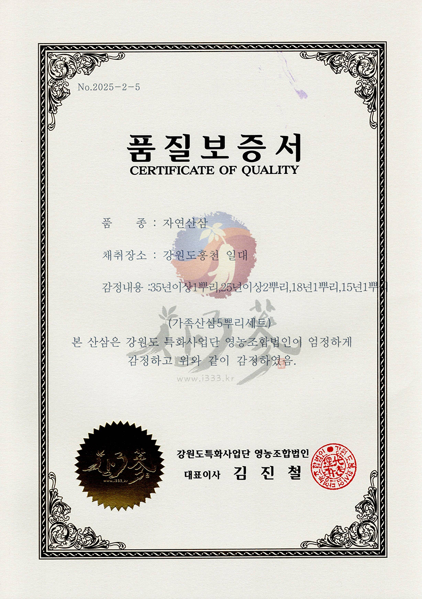 35년이상 1뿌리 + 25년이상 2뿌리 + 18년 1뿌리 + 15년 1뿌리 (총 5뿌리 가족삼 세트)